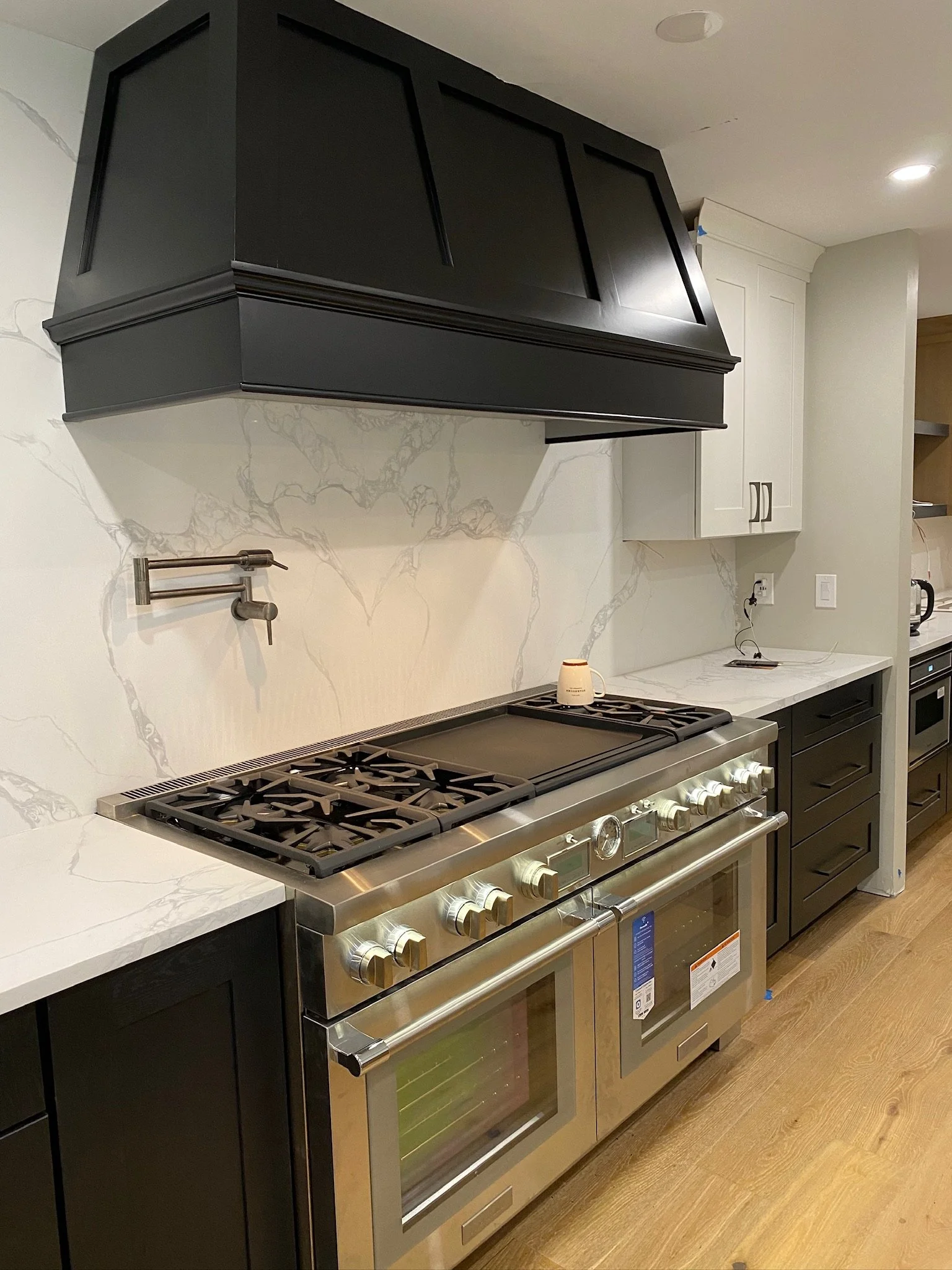 They did a full renovation of their kitchen area, adding a large island with extra seating for their children and grandchildren, a double oven and double range, industrial-sized refrigerator and freezer, and a long bar for entertaining.