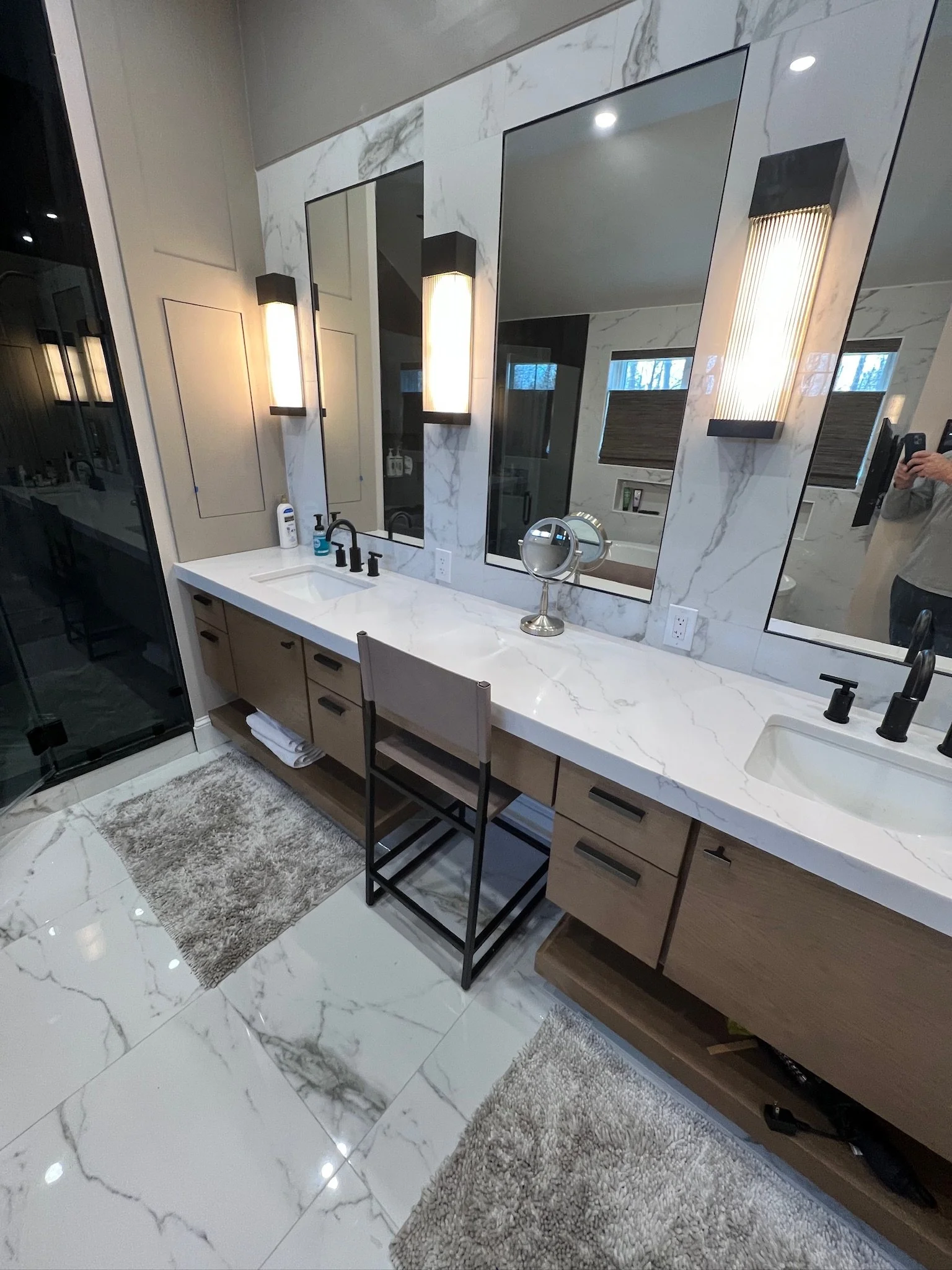 The homeowners renovated their primary bathroom for include a double sink vanity and prep area, soaking tub, and double shower. “We added thoughtful features, such as an inset shelf by the tub, and spa showerheads, to make their bathroom a restful retreat,” says Natale.