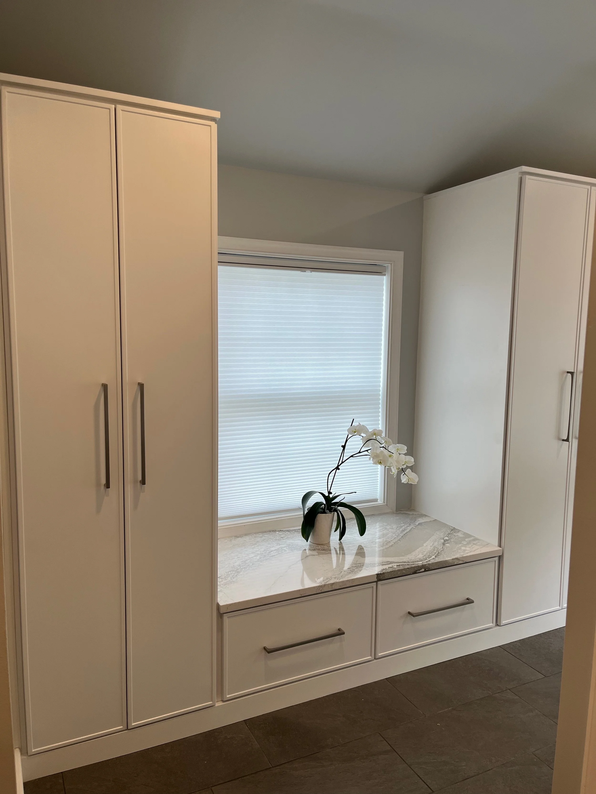Large closets and window bench seating give the homeowners ample storage for their clothing, shoes and personal items.