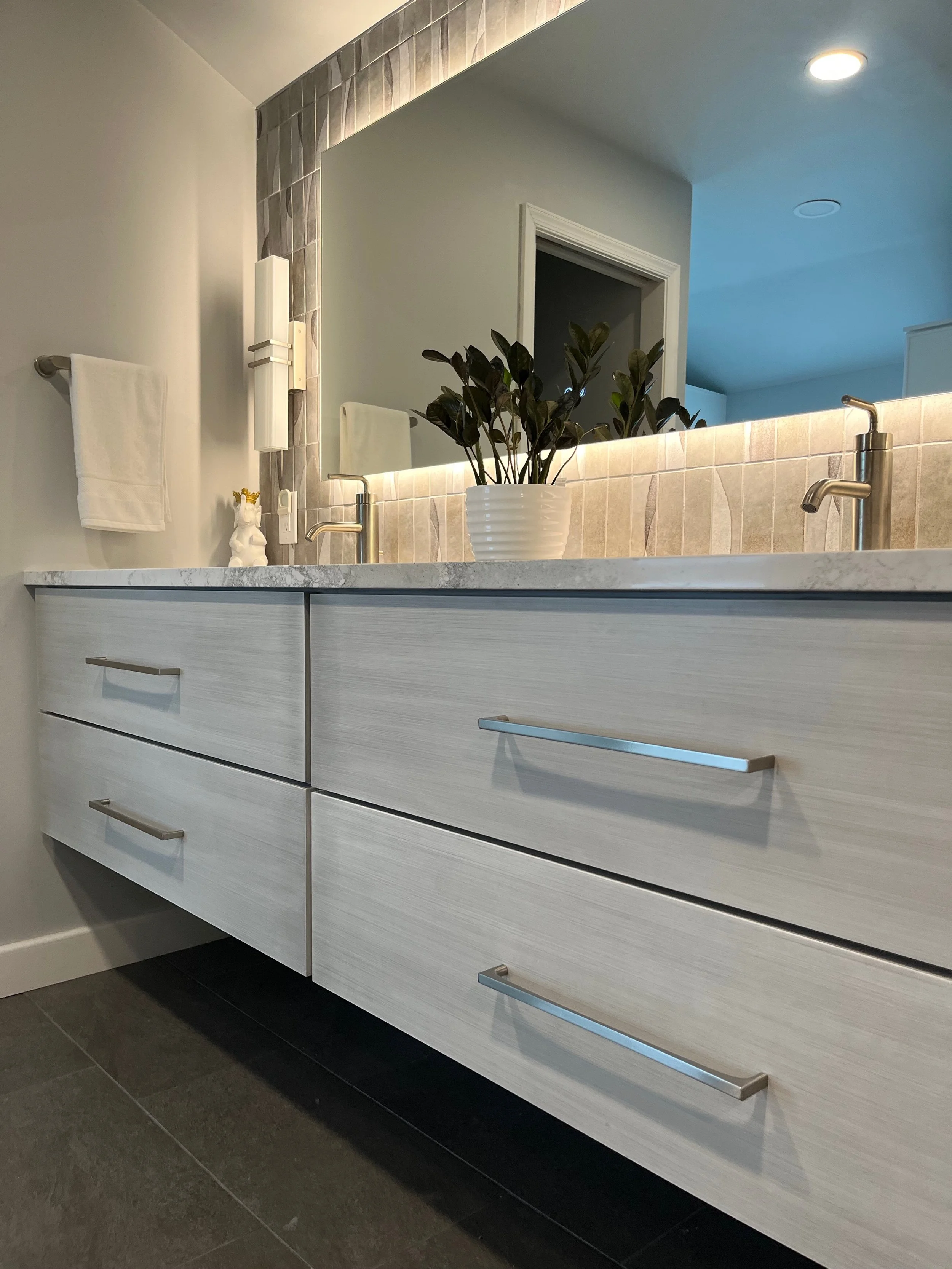 The natural tile backsplash is WOW pottery, which was inspired by the Japanese culture. Brushed cabinets with chrome accents and ambient lighting establish a clean and tranquil space for relaxing.